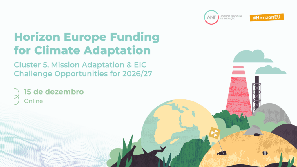 A ANI promove a sessão informativa “Horizon Europe Funding for Climate Adaptation: Cluster 5, Mission Adaptation & EIC Challenge Opportunities for 2026/27”, dedicada às oportunidades de financiamento nas áreas das ciências do clima e adaptação às alterações climáticas. Serão apresentadas as oportunidades previstas para 2026 e 2027 no âmbito da Destination 1 do Cluster 5 – Clima, da Missão Adaptação às Alterações Climáticas e do EIC Challenge ‘Deep Tech for Climate Adaptation’ do Horizonte Europa.