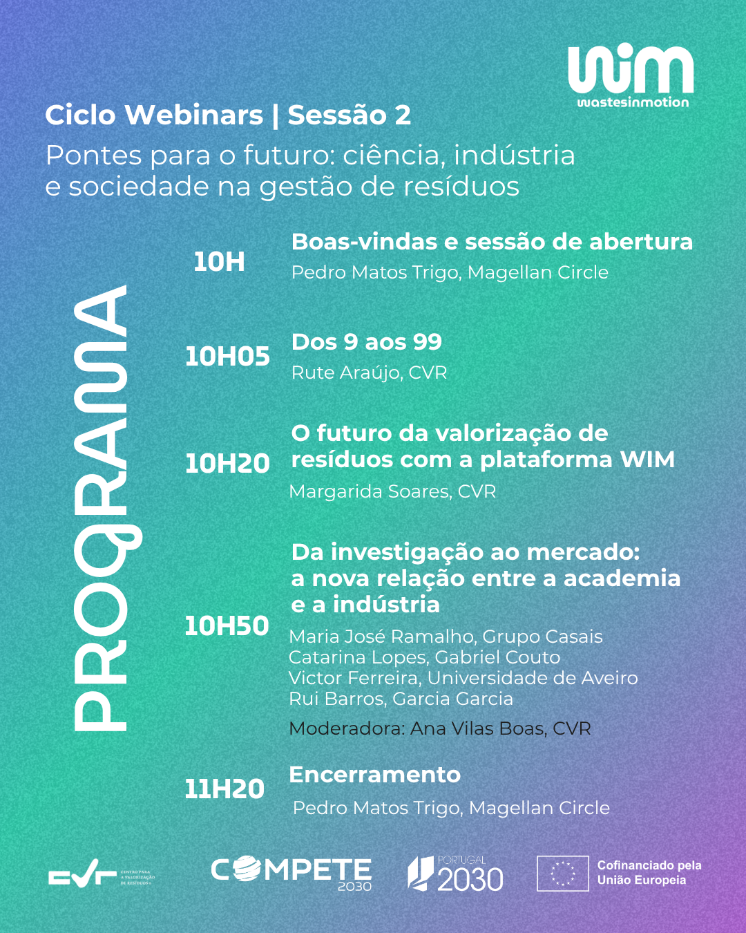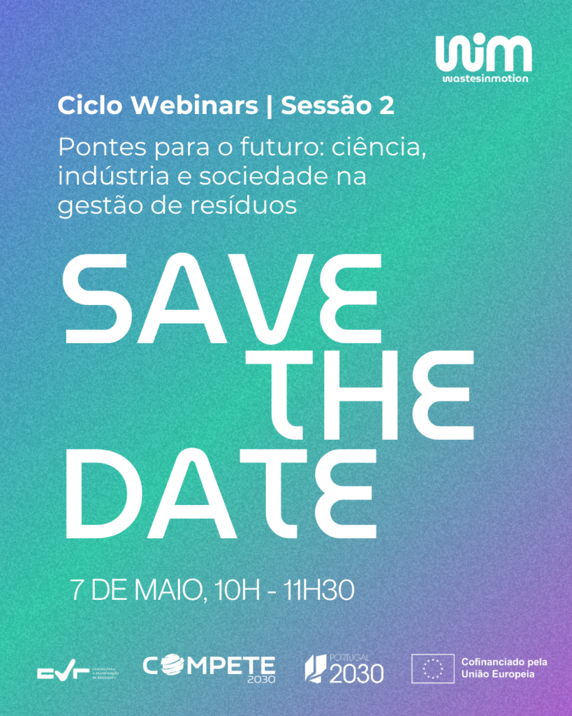 Sob o tema “Pontes para o futuro: ciência, indústria e sociedade na gestão de resíduos”, o segundo webinar do projeto pretende estimular o debate em torno da forma como a investigação académica pode ser convertida em soluções concretas de mercado, contribuindo para uma gestão de resíduos mais eficiente, inovadora e alinhada com os princípios da sustentabilidade.